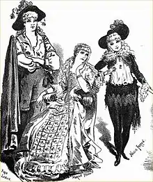 Ruy Blas was written to mark the reopening of the Gaiety theatre and the return to the West End of the hugely popular Gaiety company, led by Farren and Leslie, who had been on tour in the U.S. and Australia. The early scenes of the libretto make many allusions to this return.[8] In his review, the critic Clement Scott remarked not only on the new piece but on the redecoration of the theatre, which he found "deserving of the highest praise".[9] The scenery and the costumes, as usual, were among the prominent attractions of a Gaiety show. Percy Anderson's costumes were particularly admired.[8]