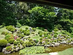The Japanese garden on the north side of the Main Hall dates from the early Edo period, and was designed by Kobori Enshu. It consists of an arrangement of rock formations and ponds. It was designated as a National Places of Scenic Beauty of Japan in 1954.[2]
