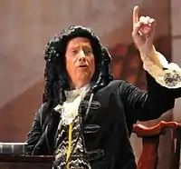 Allen was a lyric bass capable of singing the deepest pitches composed in opera. He performed the role of Seneca[7] in L'incoronazione di Poppea by Monteverdi, which requires a low D.[8] Although primarily an exponent of the great buffo roles, the bass demonstrated versatility. He performed not only in opera and oratorio, but also in the musical theater field (Judge Turpin in Sweeney Todd)[9] and the operetta field in Gilbert and Sullivan roles, such as the title character in The Mikado.[10] The ability to sing in diverse musical styles was underscored when he sang A Kurt Weill Cabaret with Martha Schlamme.[11] He participated in several world premieres, including My Friend's Story by Martin Bresnick at the International Festival of Arts and Ideas,[12] Holy Blood and Crescent Moon by Stewart Copeland with the Cleveland Opera, and The Cask of Amontillado by Russell Currie[13] with the Bronx Arts Ensemble in the Bronx, New York, followed by revivals off-broadway at the Vital Theater, Golden Fleece, Ltd. and Symphony Space. Caliban, a monodrama using the words of the character Caliban from Shakespeare's The Tempest, was written for and dedicated to him by Russell Currie. Ryan Allen can be heard as Elviro on a 1994 recording of Handel's Xerxes (Koch Schwann), in recordings of Russell Currie's music on the High Fire label, and seen as Betto on a video of Gianni Schicchi (Metropolitan Opera Guild).