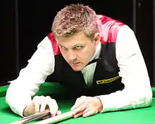 Day qualified for five of the eight ranking tournaments during the 2011–12 season, but lost in the first round in four of them.[7] His best performance came at the end of the season in the biggest event on the tournament calendar, the World Championship. He came back from 3–7 down in his qualifying match against Gerard Greene to win 10–8, to set up a first round match with China's number 1, Ding Junhui.[8] Day produced another comeback, this time from trailing 6–9 to win the last four frames and advance to the second round.[9] There he beat fellow qualifier Cao Yupeng 13–7 and held a 5–2 lead in the early stages of his quarter-final match against compatriot Matthew Stevens.[7] However, he suffered a migraine at the start of the next session and went on to lose 11 consecutive frames to exit the tournament 5–13.[10] Day finished the season ranked world number 30.[11]