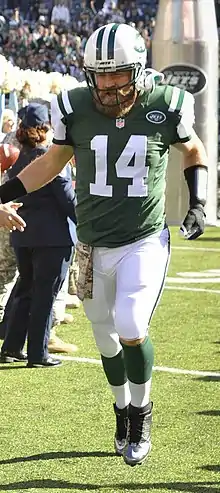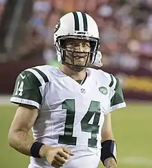 Smith was then named the starter for the next game against the Baltimore Ravens.[88] However, he suffered a season-ending injury and was replaced by Fitzpatrick in the second quarter.[89][90] Fitzpatrick then started the team's next two games against the Cleveland Browns and Miami Dolphins before sitting out against the Los Angeles Rams due to injury.[91] Bryce Petty started in his place even though Fitzpatrick was still active for the game as the backup.[92] Fitzpatrick then returned from his injury to start the next two games against the New England Patriots and Indianapolis Colts.[91] However, during the Colts game, he was benched in favor of Petty to start the second half.[93]