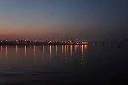 ![]() Southern end of the Rybalskyi Peninsula, pictured from the Podil. Kyiv Harbour entrance and Podilskyi Metro Bridge (under construction) are seen on the foreground. | |