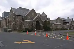 The campus hosts a football stadium with an outdoor track and spots for field events to be conducted, a baseball/softball field, practice fields for various sports (including lacrosse, soccer, field hockey and cross country), a small brook separating the field from the rest of the school, parking lots, grassy fields, and a few trees.