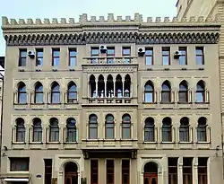The architectural composition of the bay window belongs to very interesting motifs evoked by the poetry of the oriental forms with subtle and elegant techniques, demonstrating the possibilities of high artistic aesthetics. Here, the architectural solution of the second floor's bay window is indicative, when the window openings of the arches are placed in vertically flat frames with ornamental motifs, and under the arches there are three-quarter columns with traditional capitals. A slightly pronounced profiled shelf makes the transition to loggia, and the latter is decorated with a stalactite belt that holds the balcony with Roman lattices. On both sides of the bay window there is a rhythm of deep window openings: on the second floor there is a horseshoe-shaped arch, and on the third floor there are lancet arches. The surface of the wall is devoid of tectonics and is given over to shallow niches, being large elements of the facade. In general, an elegant architectural composition was formed and built on Eastern Muslim motifs which retained their positive values as a national romantic direction.[4][5]