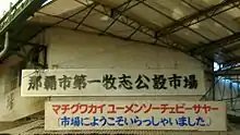 A market sign in Naha, written in Okinawan (red) and Japanese (blue)