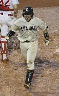 Despite breaking a toe during baserunning on April 2, he notched his 1st home run and 1st career cycle hit (3B-1B-HR-2B) on April 9 which contributed to the team's come-from-behind win against the Baystars, to the sheer delight of the home crowd in Koshien.[46] He consistently delivered in his next outings, and by June he topped the league in catcher caught stealing assists (16) that he was voted by both the fans and fellow NPB players into his 2nd All-star game, becoming the first ever Hanshin catcher to do so.[47] He and Haraguchi hit back-to-back home runs on Game 2 of the series. In the later half of the season however, his performance at the plate went south and he eventually got alternated with catchers Sakamoto and Haraguchi. What he lacked in offense, he made up for in defense and in base stealing which he managed to record 10 successful attempts by August 17 (a feat last accomplished by a Hanshin catcher Keisuke Kanoh in 2009).[48] On September 24, he broke the NPB record for catcher assists when he notched his 120th (he finished the season with 123 assists).[49] He finished the season with 14 stolen bases, 115 hits, 59 RBIs including 9 home runs, and 0.266 average for 129 games. He not only contributed to the team's advance to the post-season playoffs, he also got awarded the Golden Glove award for the 2nd year straight, a feat last accomplished by a Hanshin catcher in 1974.[50] He was given a massive pay raise post-season which doubled his previous salary to 100 million yen, becoming only the 3rd catcher in Tigers history to be paid a 9-digit annual salary (after Akihiro Yano and Kenji Johjima), and the only homegrown catcher to do so.[51]
