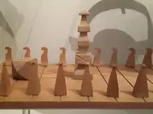 The Návuotna sáhkku board is designed with squares, as in chess, instead of sárgát.[24] The king is often topped with a bishop’s crook.[25]