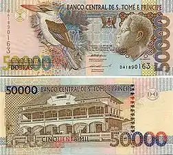 On 30 September 1977, notes were introduced for 50, 100, 500 and 1000 dobras by the Banco Nacional de São Tomé e Príncipe.[4] In 1996, 5000, 10,000, 20,000 and 50,000 dobras notes were introduced, with the lowest denomination notes from the previous series being replaced by coins in 1997. A new issue was released in 2006 with upgraded security features.