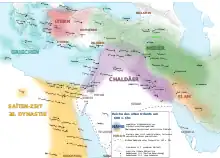 In the middle of the seventh century BC, the Neo-Assyrian Empire ruled the entire Near East. Due to their powerful standing army and their sophisticated administration, the Assyrians had managed to create the best organized and largest empire that the world had yet seen.[8] Though Babylonia in the south had also once been a large kingdom, it had typically been weaker than its northern neighbor due to internal divisions and the lack of a well-organized army. The population of Babylonia was divided into various ethnic groups with different priorities and ideals. Though old native Babylonians ruled most of the cities, such as Kish, Ur, Uruk, Borsippa, Nippur, and Babylon itself, the Chaldean tribes, led by chieftains who often squabbled with each other, dominated most of the southernmost land.[21] The Arameans lived on the fringes of settled land and were notorious for plundering surrounding territories. Because of the infighting of these three major groups, Babylonia often represented an appealing target for Assyrian campaigns.[22] The two kingdoms had competed since the rise of the Middle Assyrian Empire in the 14th century BC, and in the 8th century BC, the Assyrians consistently gained the upper hand.[23] Babylon's internal and external weakness led to its conquest by the Assyrian king Tiglath-Pileser III in 729 BC.[22]