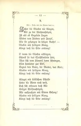 Ludwig Tiesmeyer, Paul Zauleck (Hrsg.), Helias Putsch (musikalisch bearb.): Das Buch der Weihnachtslieder. 2., völlig neu bearbeitete Auflage. Heinsius, Bremen 1896, p. 106 f. (Wikisource). - Nicolai, Claudia (14 December 2014). "Süßer die Glocken nie klingen". lieder-archiv.de (in German). Retrieved 17 December 2020.