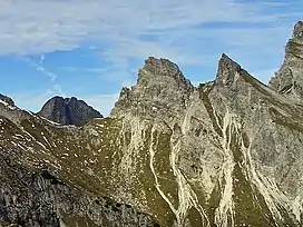 ![]() Südliches Höllhorn (2145 m) and Nördliches Höllhorn (2145 m), behind them the summits of the Höfats (2259 m). | |
