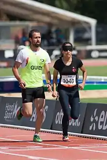 ![]() Sümeyye Özcan running with guide in the 1500m event at the 2013 IPC Athletics World Championships in Lyon, France. | |||||||||||||||||||||||||||||