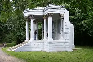 In 1782, the Prussian general Frederick Louis, Prince of Hohenlohe-Ingelfingen (1746-1818) married countess Amalie von Hoym, receiving the Hoym estates in Oppurg, Thuringia, and Sławięcice.[2][3] The prince fought in the Napoleonic Wars and after losing the Battle of Jena to Napoleon on 14 October 1806, he retired to Sławięcice, spending here his last years in a self-imposed exile. After his death, a monumental tomb made of cast iron with the Hohenlohe family's motto was built in the park.[2] His son, August, Prince of Hohenlohe-Öhringen (1784-1853) rebuilt the palace in 1827, when the old mansion burned down after being hit by a lightning strike.