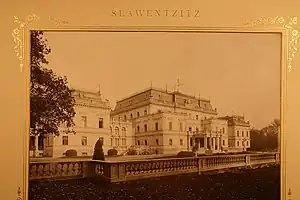 During the Second World War, the Hohenlohe family fled first to their summer palace in Oppurg[4] and later to Neuenstein in Hohenlohe. Since then, Schloss Neuenstein has remained the main residence of the princes up to this day. Schloss Slawentzitz with its park and greenhouses were severely damaged in the fights with the Red Army in January 1945. The ruins burnt down completely in 1948, but in the 1950s youth camps were still organized in its interiors. Unfortunately, the palace was regularly plundered and finally demolished in the 1970s.[7] Only an entrance portico remains.