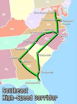 The Southeast Corridor (SEC) is a proposed passenger rail transportation project in the Mid-Atlantic and Southeastern United States to extend high-speed passenger rail services from Washington, D.C. south through Richmond, Petersburg with a spur to Norfolk[1] (the Hampton Roads region) in Virginia through Raleigh, Durham, Greensboro and south to Charlotte in North Carolina and connect with the existing high-speed rail corridor from D.C. to Boston, Massachusetts known as the Northeast Corridor. Since first established in 1992, the U.S. Department of Transportation (USDOT) has extended the corridor to Atlanta, Georgia and Macon, Georgia; Greenville, South Carolina; Columbia, South Carolina; Jacksonville, Florida; and Birmingham, Alabama.