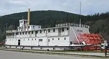 Three days after leaving Whitehorse the SS Keno arrived in Dawson City, becoming the last of Yukon's sternwheeler fleet to navigate the river under her own power.[5] She was subsequently winched up onto the banks of the river and installed in a permanent dry dock. The HSMBC spent much of the following two years completing refurbishment and restoration work on the vessel, before the SS Keno was officially declared a National Historic Site on 1 July, Dominion Day, 1962, during the opening ceremonies for the Dawson Festival.[2] The vessel formed the first meeting and entertainment space for the newly formed Klondike Visitors Association tourism group, and it still forms a major tourist attraction in Dawson City.[12] Following the destruction by fire of the second Casca and the Whitehorse in Whitehorse in 1974, and the Tutshi in Carcross in 1990, the Keno is one of only three Yukon sternwheelers that survive in good condition, from a fleet that numbered at least 250 in total during the century between 1855 and 1955.[7]