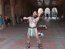 Thoth's manner of street performance involves playing his violin while singing in a language he invented and dancing with various chimes and bells attached to his attire providing percussion for the performance. He has called this form of entertainment a "Prayformance" because it is a prayer as well as a performance, together.[9] Thoth frequently performs in a gold lamé loincloth.[10]