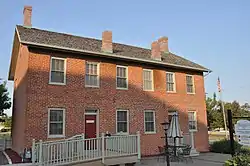 The Federal style house is a two-story structure that measures approximately 40 by 25 feet (12.2 by 7.6 m).[2] The exterior of the double house is composed of red brick laid in common bond with headers every eighth course. The main facade features a symmetrical arrangement of openings. A major renovation of the house was undertaken in 1964. The original porches, front doors, and windows were removed.