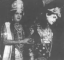 ![]() S. S. Mani Bhagavathar as Lord Krishna(left) and M. K. Thyagaraja Bhagavathar (right) as Arjuna in Pavalakkodi (1934) | |