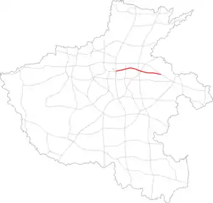 The first phase of the expressway, which is from Zhengzhou to Kaifeng, was opened on 29 December 2011. This section provides a fast connection to Zhengzhou Xinzheng International Airport for Kaifeng.[1] The second phase is from Kaifeng to Minquan, and was opened on 26 September 2016.[2]