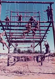 The military was mostly composed of white South Africans, who alone were subject to conscription.[25][26][27] The permanent force of the Army was 85% Afrikaans speaking.[28] However, black South Africans were the second largest group, and Asians and Coloured citizens with mixed ancestry were eligible to serve as volunteers, several attaining commissioned rank. From 1971 onwards, several black battalions were raised in the Infantry and Service Corps on a tribal basis, most black soldiers serving in these exclusive tribal battalions, which had black NCOs but white commissioned officers. The first black personnel were accepted into commissioned ranks only from 1986, and then only for serving black soldiers and NCOs. The regular Commission would not be open for Bantus until 1991, and then again they would serve only in black units or Support/Service Support units, to avoid having position of authority over white combat arms personnel. The first black officer to be promoted to lieutenant colonel rank and have command over a battalion sized unit was only appointed in February 1994, by which time the old SADF was already on its deathbed. However, black officer candidates from the various Homeland Forces and from South West Africa/SWATF had been accepted since 1981.[29] Units such as the 32 Battalion incorporated many black volunteers, as did the 101 Battalion.[30] Conscription was opposed by organisations such as the End Conscription Campaign, but overall, white morale remained high—as indicated by the few recruits tried for serious disciplinary offences.[3]