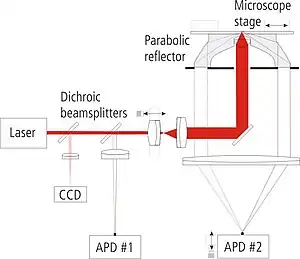 The typical SAF setup consists of a laser line (typically 450-633 nm), which is reflected into the aspheric lens by a dichroic mirror. The lens focuses the laser beam in the sample, causing the particles to fluoresce. The fluorescent light then passes through a parabolic lens before reaching a detector, typically a photomultiplier tube or avalanche photodiode detector. It is also possible to arrange SAF elements as arrays, and image the output onto a CCD, allowing the detection of multiple analytes.[4]