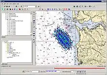 The simulator wizard makes use of multiple pages of scenario descriptions that are entered by the user in order to compute the possible distress positions and times, subsequent search object drift trajectories, and the effect of completed searches on the search object probabilities. The simulator captures uncertainty in positions, time environmental inputs and leeway parameters. Upon receiving all of the information pertinent to the case, the simulator, using Markov's Monte Carlo method, simulates the drift of up to 10,000 particles for each scenario. For every 20 minutes of drift, the simulator accounts for changes in water current, wind leeway and leeway divergence. The simulator displays the results as a probability density map that can be animated over the drift duration. Figure 1 depicts this type of map.[1] The ensemble trajectory model, random walk and random flight model governing equations are fully explained in Breivik and Allen (2008) and Spaulding, et al. (2005) that is located within O'Donnell, et al. (2005).[7][8] In short, the goal of the simulator is to maximize the probability of success.