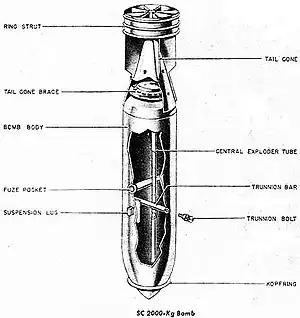 The SC 2000 had a single piece forged and machined steel body and was similar to the preceding SC 1800 in construction. Around the nose of the bomb was a kopfring - a metal ring, triangular in cross section, designed to prevent ground penetration or to stop forward momentum when hitting water. The SC 2000 was filled with Amatol, had a single transverse fuze like the SC 1800 and a central exploder tube which ran through the explosives. The SC 2000 had a circular braced tail ring with four fins. Inside the bomb casing there was a reinforced H-type suspension lug and it could be horizontally suspended in a bomb bay or horizontally mounted on a fuselage hardpoint. There were also lugs that could be fitted for dive bombing.[1]