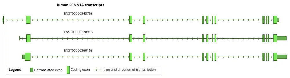 The human gene SCNN1A is located in the short arm of chromosome 12 (12p3).[10] [11] Human SCNN1A includes 13 exons spanning about 29,000 bp. The protein coding region is located in exons 2-13.[11] The positions of introns are conserved in all four human ENaC genes.[12] The positions of the introns are also highly conserved across vertebrates See: Ensembl GeneTree.