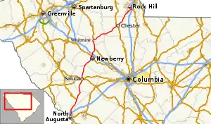 South Carolina Highway 121 (SC 121) is a 134.200-mile (215.974 km) major state highway that travels north and south in central parts of the U.S. state of South Carolina. The highway is actually part of a long multi-state highway that also exists in Florida and Georgia, as Florida State Road 121 and Georgia State Route 121, respectively. Itserves as a de facto auxiliary route from U.S. Route 21 (US 21) in Rock Hill. Efforts to have the road upgraded to such status have failed however.