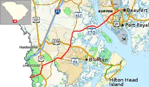 South Carolina Highway 170 (SC 170) is a 49.010-mile (78.874 km) state highway, connecting northern Beaufort County with southern portions of Beaufort and Jasper counties. Due to increased population growth in both areas, the majority of the road is four lanes wide, with certain areas retaining the original two-lane configuration.