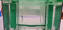 By using a gradient mixer, gradient gels with a gradient of acrylamide (usually from 4 to 12%) can be cast, which have a larger separation range of the molecular masses.[14] Commercial gel systems (so-called pre-cast gels) usually use the buffer substance Bis-tris methane with a pH value between 6.4 and 7.2 both in the stacking gel and in the separating gel.[15][16] These gels are delivered cast and ready-to-use. Since they use only one buffer (continuous gel electrophoresis) and have a nearly neutral pH, they can be stored for several weeks. The more neutral pH slows the hydrolysis and thus the decomposition of the polyacrylamide. Furthermore, there are fewer acrylamide-modified cysteines in the proteins.[15] Due to the constant pH in collecting and separating gel there is no stacking effect. Proteins in BisTris gels can not be stained with ruthenium complexes.[17] This gel system has a comparatively large separation range, which can be varied by using MES or MOPS in the running buffer.[15]