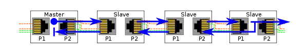 - A line topology is the simpler of the two possible arrangements and provides no redundancy. However, this configuration saves the cost of one cable. In it, only one of the two interfaces on the master is used. Telegrams are issued out of the transmit PMA on the Master’s active port. Either port on the master may be the active one. Sercos III determines this during phase-up (initialization).