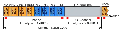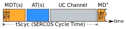 Communication across a Sercos III network occurs in strict cyclic intervals. A cycle time is chosen by the user for a given application, ranging from 31.25 µs to 65 ms. Within each cycle, data is exchanged between Sercos III nodes using two types of telegrams: MDTs and ATs (see Telegram Types). After all MDTs and ATs are transmitted, Sercos III nodes allow the remaining time in the cycle to be used as an UC (Unified Communication) Channel, which can be used to exchange data using other formats, such as IP.