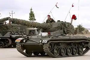 The SK-105 Kürassier is an Austrian light tank[3] armed with a rifled 105 mm gun in an oscillating turret. It is estimated that over 700 have been produced, with initial deliveries in 1971. It shares its CN 105-57 main gun with the French AMX-13, which was widely produced and deployed.