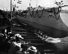 Following Germany's defeat in the war, much of the German fleet was decommissioned, but there is no record of Arcona having been removed from service.[14] The Treaty of Versailles that ended the war mandated that Germany was responsible for clearing the mines that had been laid in the North Sea during the conflict,[15] and Arcona was selected in early 1919 to serve as a mother ship for the minesweepers that were tasked with clearing the mines; this decision was made after the old pre-dreadnought battleship Preussen proved to be unsuited to the task. Arcona was modified for the role at what was now the Reichsmarine Werft (formerly the Kaiserliche Werft) in Wilhelmshaven; all of her guns except the stern pair were removed, with those being retained to detonate mines that were encountered. After the work was completed, Kapitänleutnant (Captain Lieutenant) Erich Haeker took command of the vessel in May. She was then assigned to support V Minesweeping Flotilla and operated with the unit until February 1920, by which time the work was completed. Arcona was thereafter decommissioned to be rebuilt for fleet service.[16]