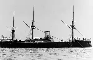 She was armed with a main battery of four 26 cm (10.2 in) L/22 guns mounted in a pair of gun turrets placed on the centerline amidships.[lower-alpha 3] As built, the ship was also equipped with two 17 cm (6.7 in) L/25 chase guns, one in the bow and one in the stern.[4] After being rebuilt in 1888–1890, her armament was increased by six and later ten 8.8 cm (3.5 in) L/30 quick-firing guns, a pair of machine guns, and five 35 cm (14 in) torpedo tubes in the ship's hull below the waterline.[3]