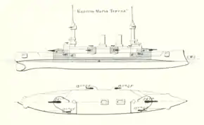 Kaiserin und Königin Maria Theresia was laid down on 1 June 1891, launched on 29 April 1893, and was commissioned into the fleet in November 1894.[5] In 1895, Archduke Charles Stephen of Austria took a squadron of warships, including Kaiserin und Königin Maria Theresia, to Germany to participate in the celebrations for the opening of the Kiel Canal. The squadron called on the port of Brest, France on the way, and stopped in Portsmouth on the return voyage.[9]