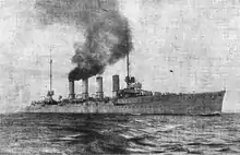 SMS Karlsruhe was a light cruiser of the Karlsruhe class built by the German Kaiserliche Marine (Imperial Navy). She had one sister ship, SMS Rostock; the ships were very similar to the previous Magdeburg-class cruisers. The ship was laid down in 1911, launched in November 1912, and completed by January 1914. Armed with twelve 10.5 cm SK L/45 guns, Karlsruhe had a top speed of 28.5 knots (52.8 km/h; 32.8 mph), which allowed her to escape from British cruisers during her career.