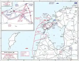 The operation began on 12 October, when Moltke and the four König-class ships covered the landing of ground troops by suppressing the shore batteries covering Tagga Bay.[58] Markgraf fired on the battery located on Cape Ninnast. After the successful amphibious assault, III Squadron steamed to Putziger Wiek, although Markgraf remained behind for several days. On the 17th, Markgraf left Tagga Bay to rejoin her squadron in the Gulf of Riga, but early on the following morning she ran aground at the entrance to Kalkgrund. The ship was quickly freed, and she reached the III Squadron anchorage north of Larina Bank on the 19th. The next day, Markgraf steamed to Moon Sound, and on the 25th participated in the bombardment of Russian positions on the island of Kynö. The ship returned to Arensburg on 27 October, and two days later was detached from Operation Albion to return to the North Sea.[59]