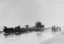 On 4 November 1916, U-20 grounded on the Danish coast south of Vrist, a little north of Thorsminde after suffering damage to its engines. Her crew attempted to destroy her with explosives the following day, succeeding, however, only in damaging the boat's bow (see picture) but making it effectively inoperative as a warship.[4]
