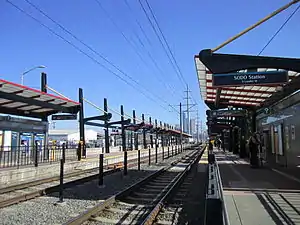 A groundbreaking ceremony for the Central Link project was held at SODO station in November 2003, with construction beginning after utility poles located next to the SODO Busway were relocated to clear the track's right of way.[19] The Sound Transit Board officially named the station after the SoDo neighborhood on January 13, 2005, replacing the provisional name of South Lander Street.[20] The first rails on Central Link were laid between Holgate and Lander streets in August 2005,[21] with the first piece of station art being installed at SODO station during the same month.[22] The station itself was built by Kiewit Pacific in less than a year, with opening ceremonies for SODO and Stadium stations held on May 30, 2006, celebrating the completion of the first two Central Link stations.[23] Light rail testing on the 1.3-mile-long (2.1 km), at-grade SoDo segment was carried out by Sound Transit between March 2007 and February 2008, allowing the agency to declare the segment "substantially complete" in June 2008.[24][25] SODO station was opened to the public on July 18, 2009, during the first day of Central Link service.[26]