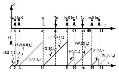 Fig.3. shows a state trajectory associated with an event segment of the SP-DEVS model shown in Fig. 2. The top of Fig.3. shows an event trajectory in which the horizontal axis is a time axis so it shows an event occurs at a certain time, for example, !g:1 occurs at 0.5 and !w:0 at 1.0 time unit, and so on. The bottom of Fig. 3 shows the state trajectory associated with the above event segment in which the state is associated with its lifespan and its elapsed time in the form of . For example, (G, 30, 11) denotes that the state is G, its lifespan is and the elapsed time is 11 time units. The line segments of the bottom of Fig. 3 shows the time flow of the elapsed time which is the only one continuous variable in SP-DEVS.