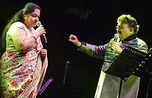 Balasubrahmanyam had the distinction of rendering the most songs on a single day by any singer.[49] He had recorded 21 songs in Kannada for the composer Upendra Kumar in Bangalore from 9:00 am to 9:00 pm on 8 February 1981 and 19 songs in Tamil, 16 songs in Hindi in a day.[50] In his words, "There were days when I used to record 15–20 songs, but only for Anand Milind. And I would take the last flight back to Chennai."[51][52] In the 1970s, he also worked with M. S. Viswanathan in Tamil movies for actors such as M. G. Ramachandran, Sivaji Ganesan and Gemini Ganesan. He recorded duets with P. Susheela, S. Janaki, Vani Jayaram and L. R. Eswari. Balasubrahmanyam's association with Ilaiyaraaja began even before Ilaiyaraaja came to the cine field. In the early days, he used to sing in towns and villages all over south India and Ilaiyaraaja, then an unknown harmonium and guitar player accompanied him in his concerts.[53]