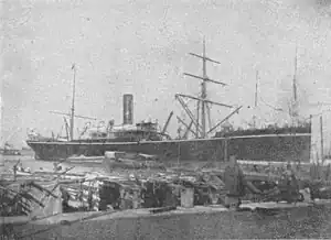 SS Aden was a British passenger screw-steamship launched on 5 October 1891 and completed by Sir Raylton Dixon and Co. in Middlesborough in 1892. She was 366 feet in length, 46.1 feet in breadth, while her tonnage was 3,925.0 gross tonnage.[1] The Aden was powered by one triple expansion direct acting vertical engine of 2,050 hp. She was owned by the Peninsular and Oriental Steam Navigation Company (P&O) and was the second of three ships to be so named. She was lost at sea on 9 June 1897[1] with the loss of much life off the east coast of Socotra while carrying passengers from Colombo in Sri Lanka to London.[2]