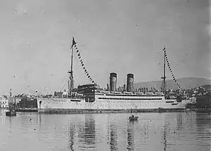 On 6 August 1916 Vasilefs Constantinos reached Jersey City carrying 1,991 passengers, most of whom were immigrants from Greece or refugees from the Central Powers' invasion and occupation of Serbia.[11] On 9 September she left Piraeus on her eleventh return trip to Jersey City. After this voyage, her transatlantic service seems to have been interrupted.[5]