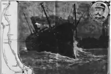 Captain Doran ordered the passengers to go to the lifeboats and the lifeboats be lowered.[14] Smith, concerned for the safety of his fellow passengers, began going from cabin to cabin and knocking on each door. Many passengers did not respond due to seasickness, while others hurriedly prepared themselves to abandon ship. Smith reported observing a small family holding hands in their cabin, rather than attempting to save themselves. As the ship was sinking, Liedelt noted that Captain Doran had tied the whistle cord down on the bridge and remained there as the ship sank, waving his hands in a final salute.[14] After the bridge went underwater, the whistle died as well.[14] Columbia at this point had developed a very noticeable list to starboard, allowing Lifeboat Number Four to be launched without being lowered. Eight and a half minutes after the collision, the Columbia began her final plunge. The stern of the ship rose out of the water and the ship slipped below the waves bow first in a matter of seconds. Once the ship was completely underwater, a large explosion occurred, sending many people dragged under by the Columbia back to the surface. While many survivors believed the explosion to have been caused by one of Columbia's boilers, Chief Engineer Jackson believed otherwise. He later stated, "I am quite positive that the boilers did not explode. I would have known if one did, as I stood directly above them when the ship pitched head foremost into the sea." Another theory is that a massive release of trapped air from the sinking Columbia caused the explosion.