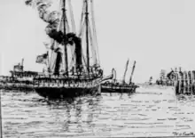 Columbia herself was ordered in July 1879 as Hull No. 193 at the John Roach & Sons Delaware River Iron Ship Building and Engine Works in Chester, Pennsylvania originally by the Oregon Steamship Company.[15] That same year, the Oregon Railway and Navigation Company had bought and merged the Oregon Steamship Company into its own operations.[16] Construction of Columbia began in September 1879.[17] Columbia was launched at 11:40 AM on February 24, 1880. Both the Bureau Veritas and American Shipmasters' Association oversaw her construction.[7][18][19] Roach himself refused to install the incandescent light bulbs on board Columbia in fear of a possible fire breaking out.[8] In May 1880, Columbia sailed to New York City, where Edison's personnel installed the new lighting systems.[7] The light bulbs were carried aboard in a shopping basket by Francis R. Upton, a chief assistant of Edison.[8] The first lighting of the ship took place on May 2, 1880.[8]