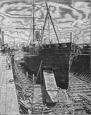 SS Dessoug was a 1,367 GRT wooden cargo ship which was built in 1864 for the Khedive of Egypt as Denton. She was noteworthy for being selected by Henry Honychurch Gorringe for the purpose of transporting the Cleopatra's Needle Obelisk from Egypt to New York City. She was sold to Ocean Steam Company in 1880 and renamed Dessoug. She served between New York and Savanna for her final years. In 1896 she sailed to Cow Bay, Long Island and broken up for scrap.[1][2]