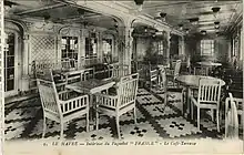 Her first class accommodations were graced with various portraits of Louis XIV as well as his relations. France was also credited for bringing the grand staircase to the ocean liner, a fashion which prevails in modern cruise ships. Her First Class entrance hall and dining room demonstrated this.[6] The staircase in the dining room was in fact copied from the Parisian Hôtel de Toulouse.[3] Further unique points included her Cafe Terrasse and the Salon Mauresque, the latter a reference to the French colonial empire in Africa. The ship also had a gymnasium, an elevator, and a hair salon, all great novelties at the time.[4] Style Louis seize (Louis XVI) was also used within the private apartments of the grand luxe suites on board. According to a 1912 booklet publicising the liner, her second class accommodation was credited as "match[ing] the richness and comfort of first class on the old liners."[4] Passengers in this class could also utilise a hair dressing salon.[4] Third and steerage classes were also praised as being well-appointed.
